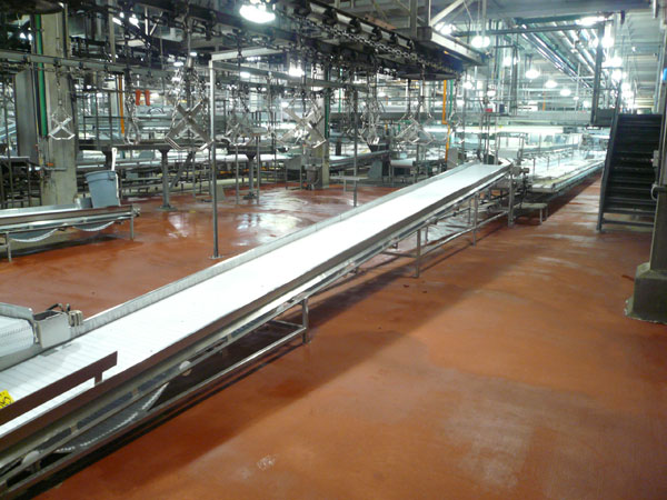 Interior of a food processing facility featuring long conveyor belts and bright overhead lights, with a clean, red floor.
